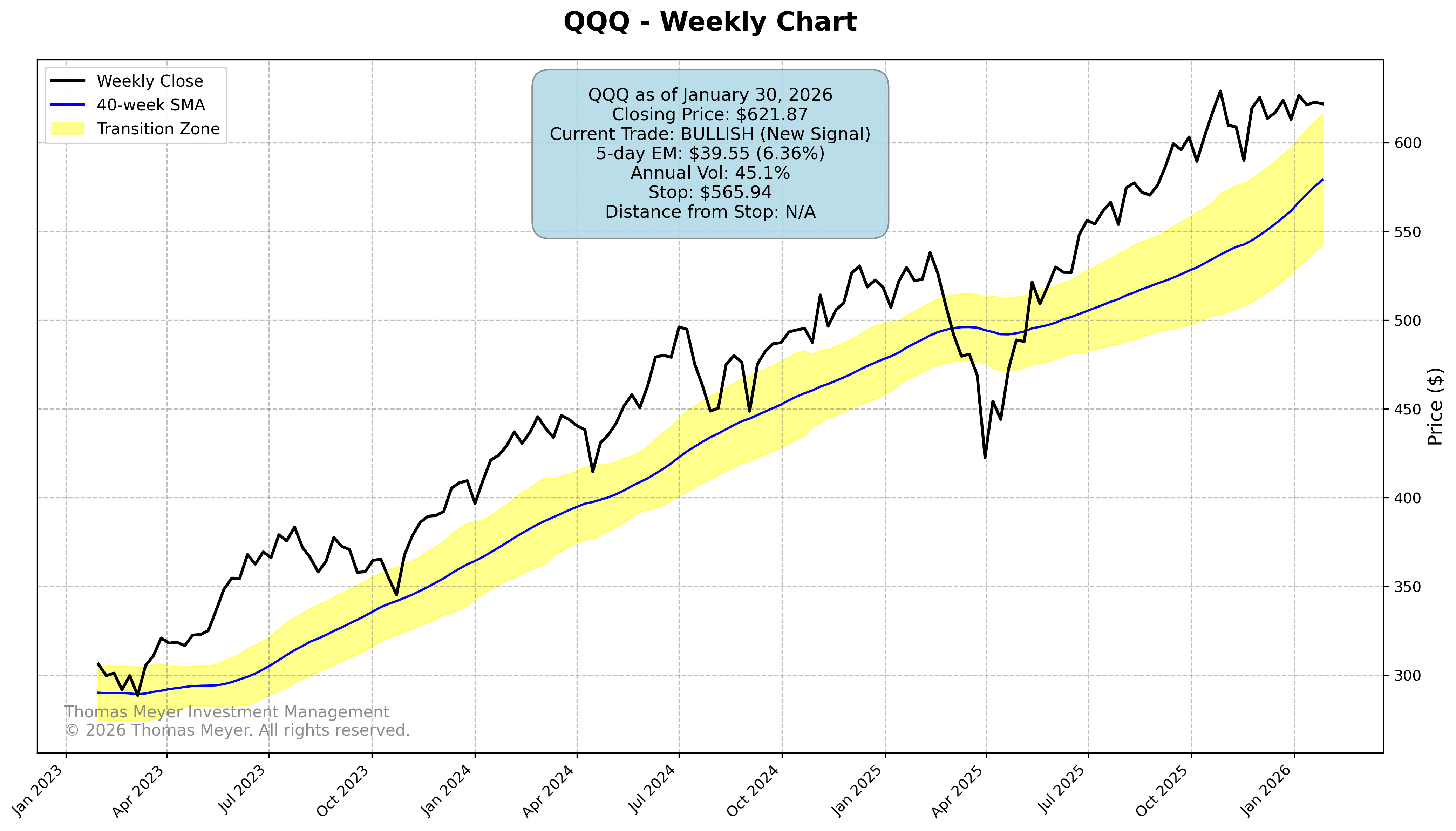 · The Nasdaq 100 is down 2% so far tonight. The new bullish trade in QQQ is cancelled if the opening trade is $615.79 or lower. In overnight trading, QQQ is at about $612.79 which, if this were the opening price, would cancel the new trade.