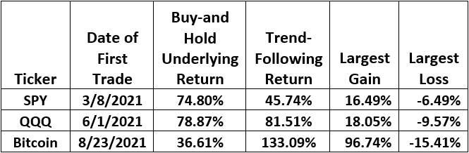 The trend-following approach I use has a decade-long track record across multiple newsletters in three countries. Here are the results for SPY, QQQ, and Bitcoin since I started publishing on Substack: