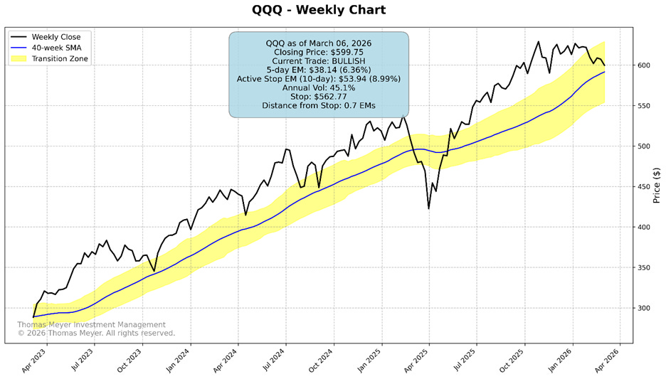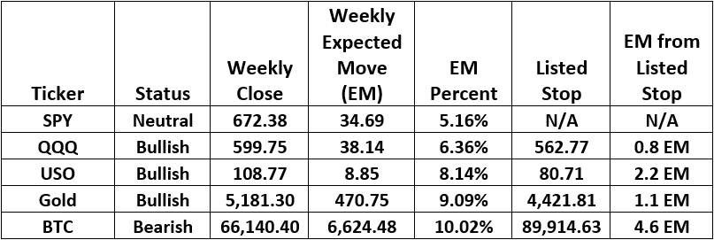 There were no changes in any of our other trades. Gold dropped a little last week, but the stop continued moving higher, which locks in more profit. SPY remains in a Neutral condition. QQQ hasn’t hit its stop, but it’s less than 1 EM away.
