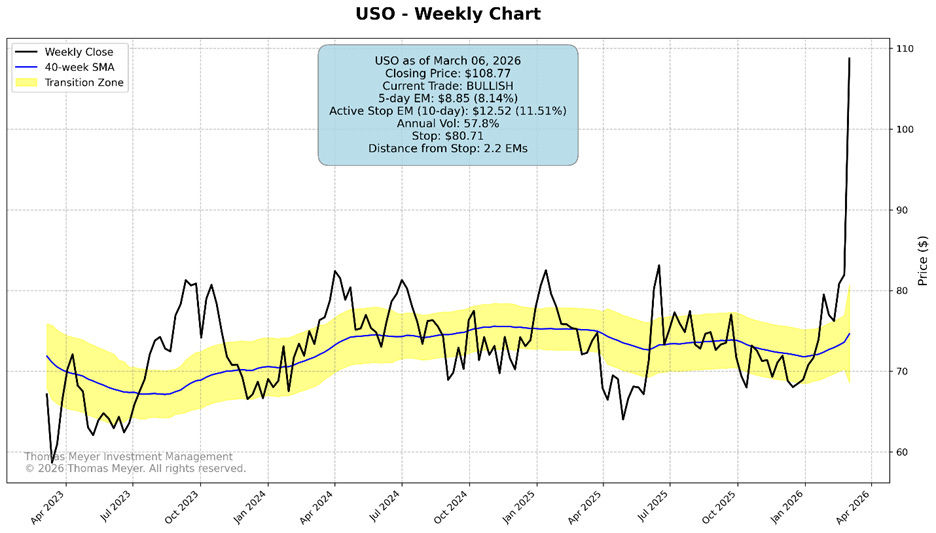 Oil dominates this week’s discussion. Our USO trade, entered exactly one month ago at $76.83, closed Friday at $108.77—that’s a 42% gain in 30 days. Monday morning it’s trading even higher. This is what happens when geopolitical risk meets supply constraints.
