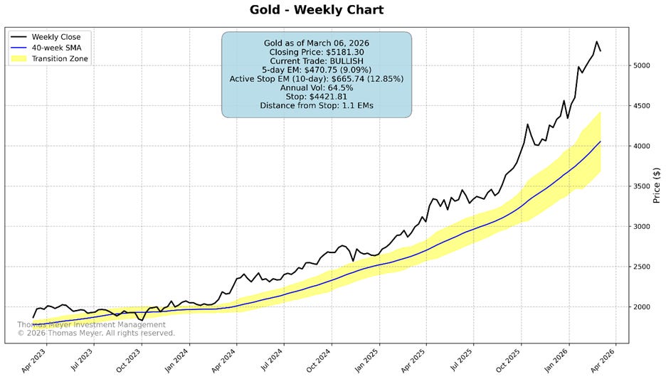 Gold pulled back slightly but the stop keeps rising, locking in more profit. Now sitting 1.1 Expected Moves from exit with 95% gains since January 2025.