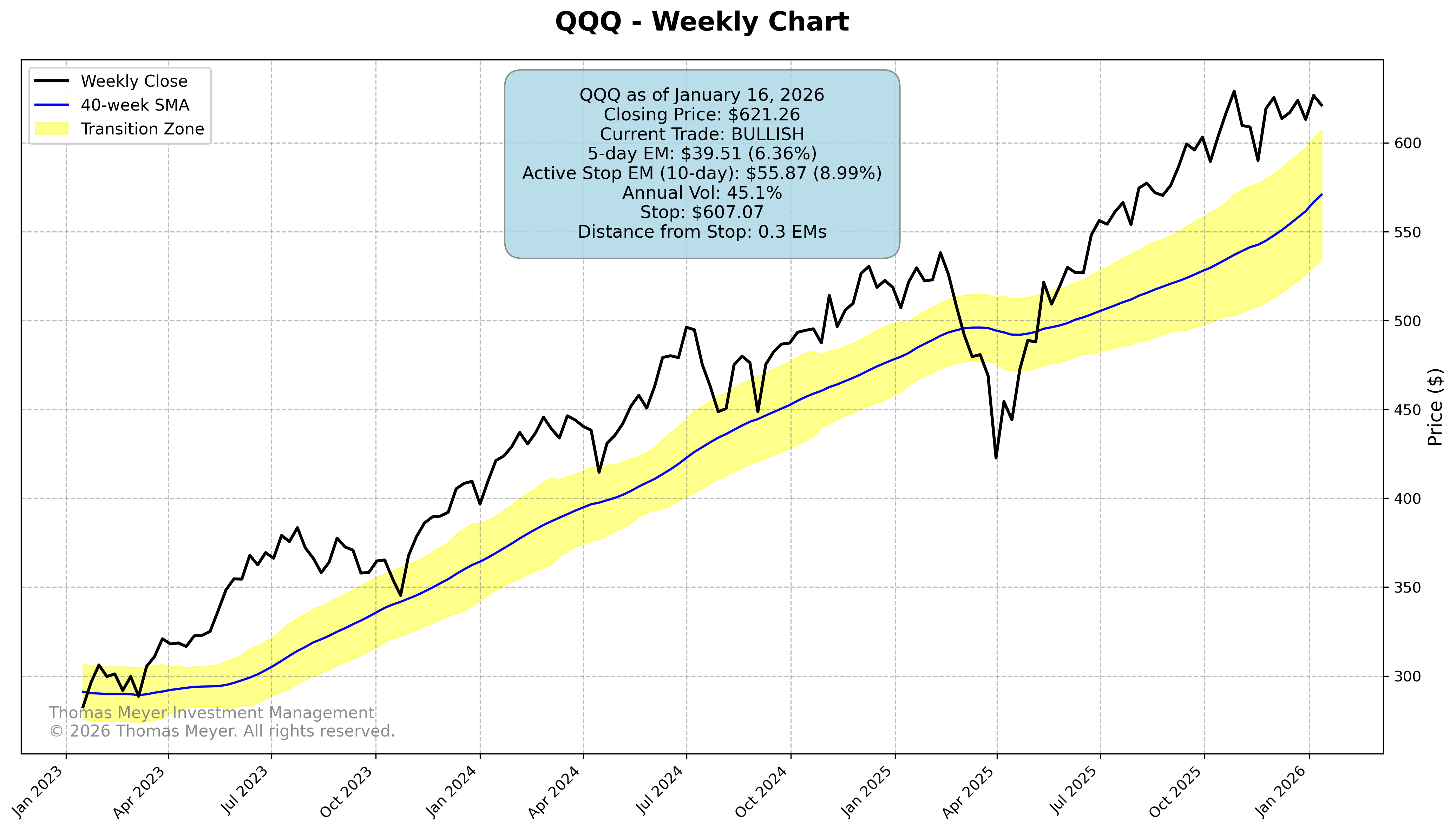 It’s natural for us to focus on the major averages when looking at our investments. We look at the S&P 500 and the Nasdaq 100 and use those averages to determine how the market is doing. Right now, if you look at SPY and QQQ, you can see that they’re leveling off and, in our trend-following world, close to hitting their exits.