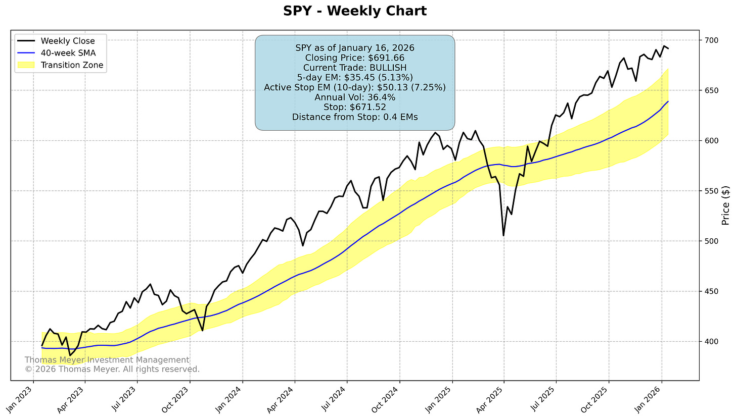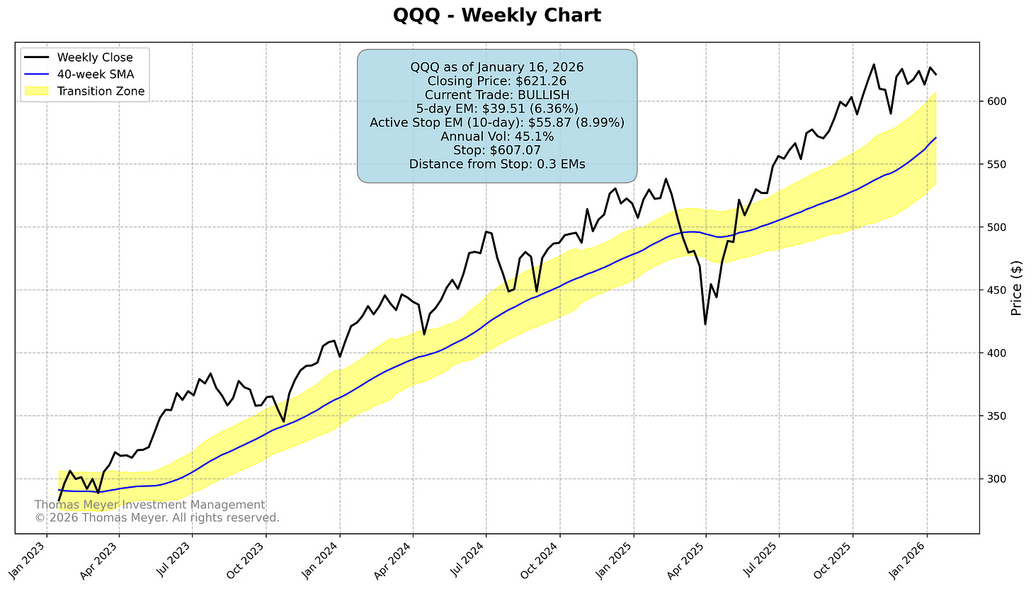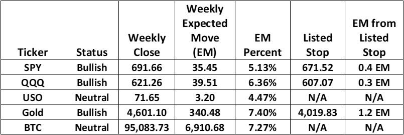 Both SPY and QQQ closed lower this week and are now dangerously close to their exits—SPY at 0.4 Expected Moves away, QQQ at just 0.3 Expected Moves. With markets looking to open sharply lower Monday morning, these stops could easily get hit. If you’re following these trades, make absolutely certain your exit orders are in place before the open.