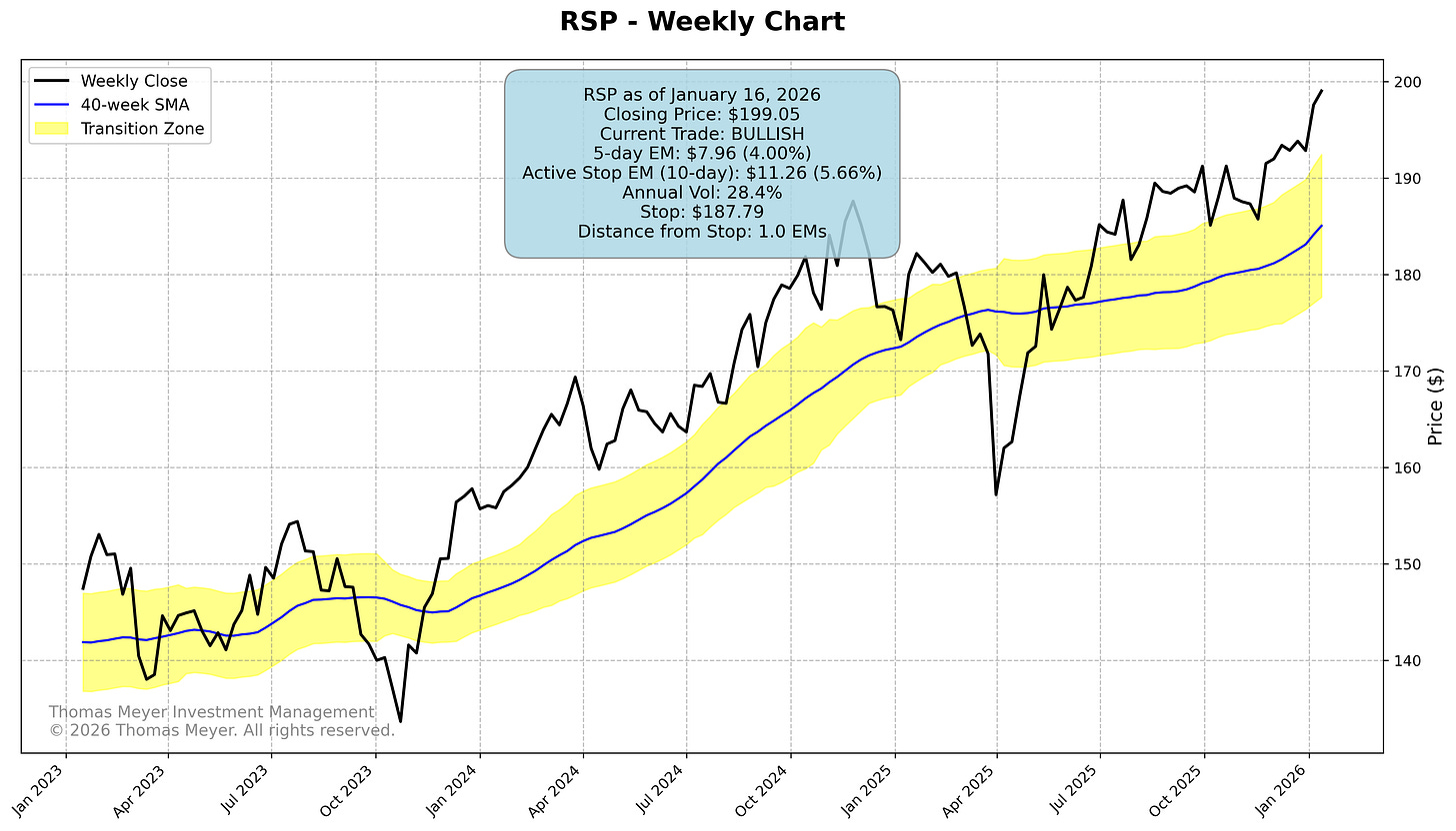 Why do I care about RSP? Because looking at this chart gives us more information as to what the majority of listed stocks are doing. And right now, those stocks are doing quite well. Here’s the most recent chart on RSP: