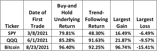 The trend-following approach I use has a decade-long track record across multiple newsletters in three countries. Here are the results for SPY, QQQ, and Bitcoin since I started publishing on Substack:
