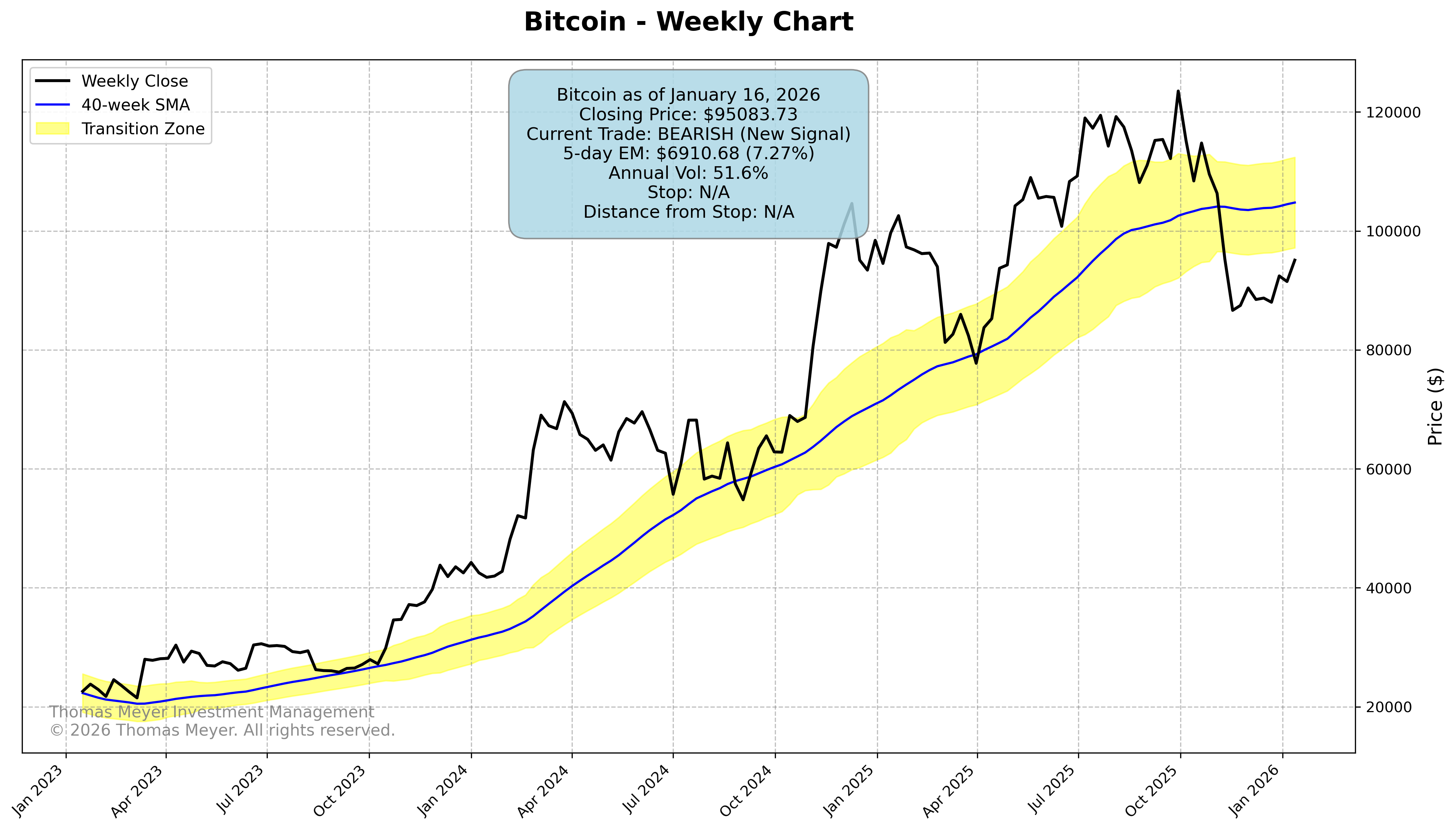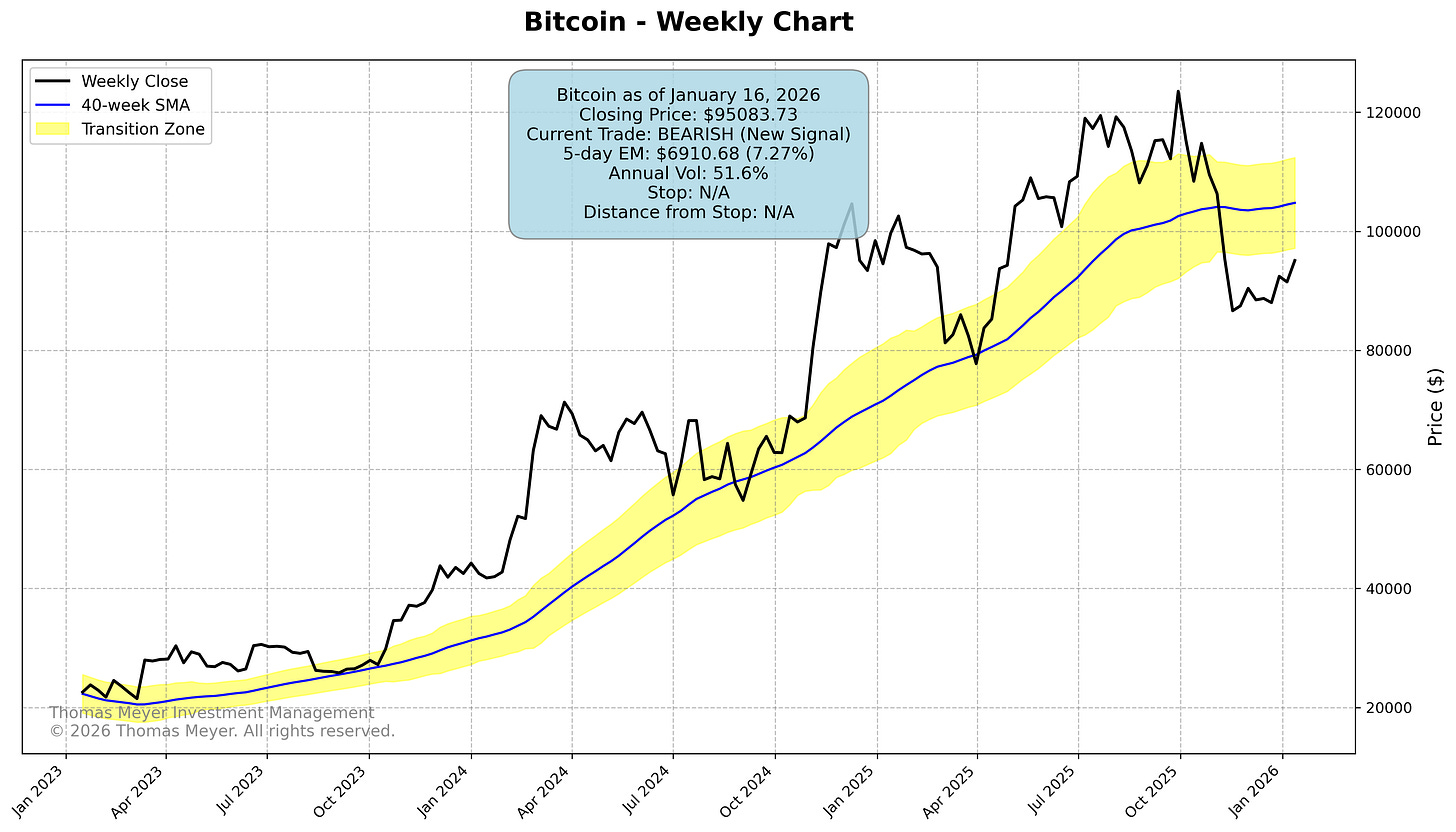 Bitcoin hit its bearish exit last week and is now sitting in neutral territory below the Transition Zone. No trade this week—we’ll wait for the next clear signal.
